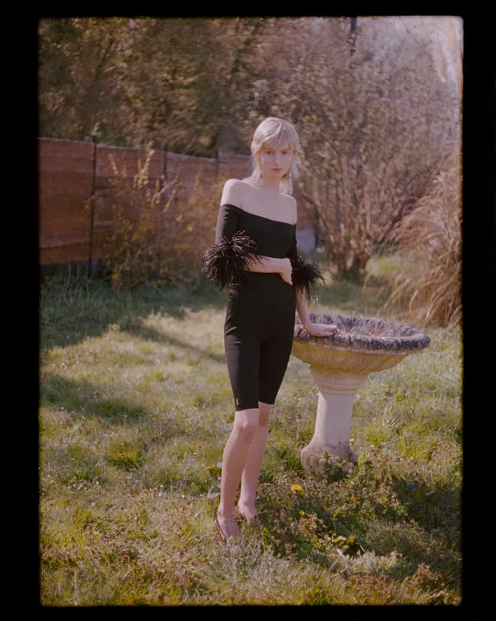 Saint Laurent by Anthony Vaccarello jersey bodysuit with feather trim, and metal, glass and lacquer earrings, Saint Laurent