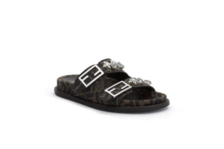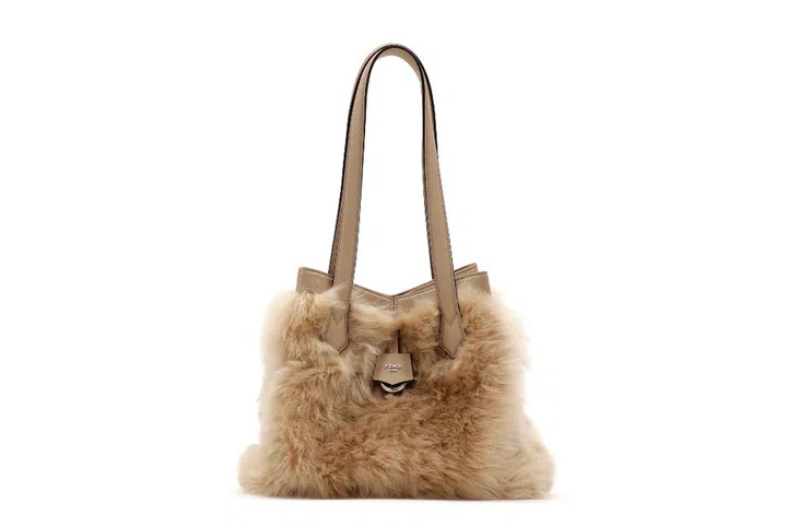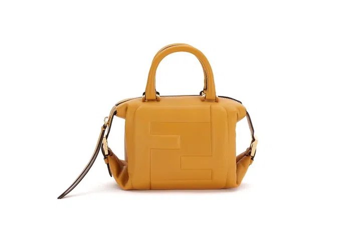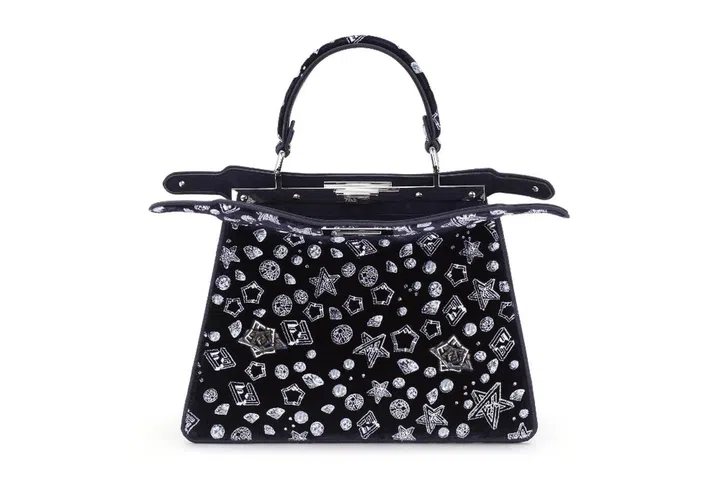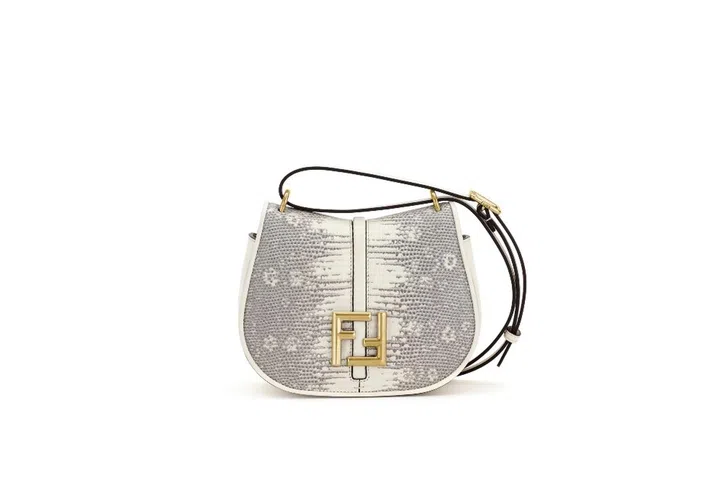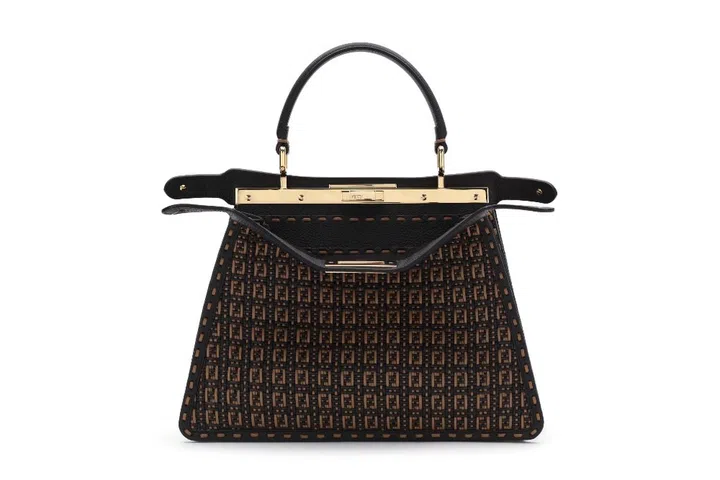 A playful reimagining of the Peekaboo by Stefano Pilati, this iteration features strips of leather artfully interlaced to create a mosaic of miniature FF motifs.