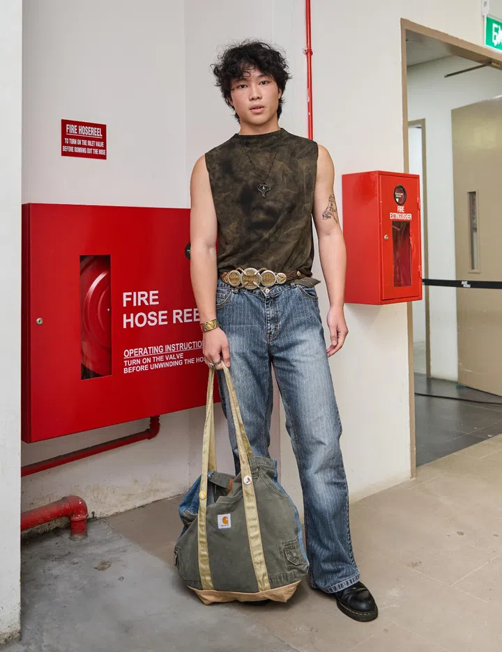 His fit: "The cropped top I'm wearing was thrifted by my girlfriend, who lent it to me while she was away on exchange. I've spent the past two months in Europe with her, celebrating the end of my two years in NS. That's where I acquired the rest of my pieces. The flared jeans were thrifted in Norway, the necklace was from a vintage shop in Prague, and the three rings were from flea markets in Osaka, Berlin, and Amsterdam. Additionally, my belt was thrifted in Athens. I bought my Dr. Martens Wincox boots for half price on Carousell."