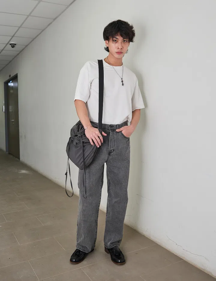 His fit: "I'm wearing a simple casting outfit – a white tee and straight grey jeans from GU, paired with loafers I bought in Japan. I added my own touch to the casting outfit by opting for grey jeans and loafers."