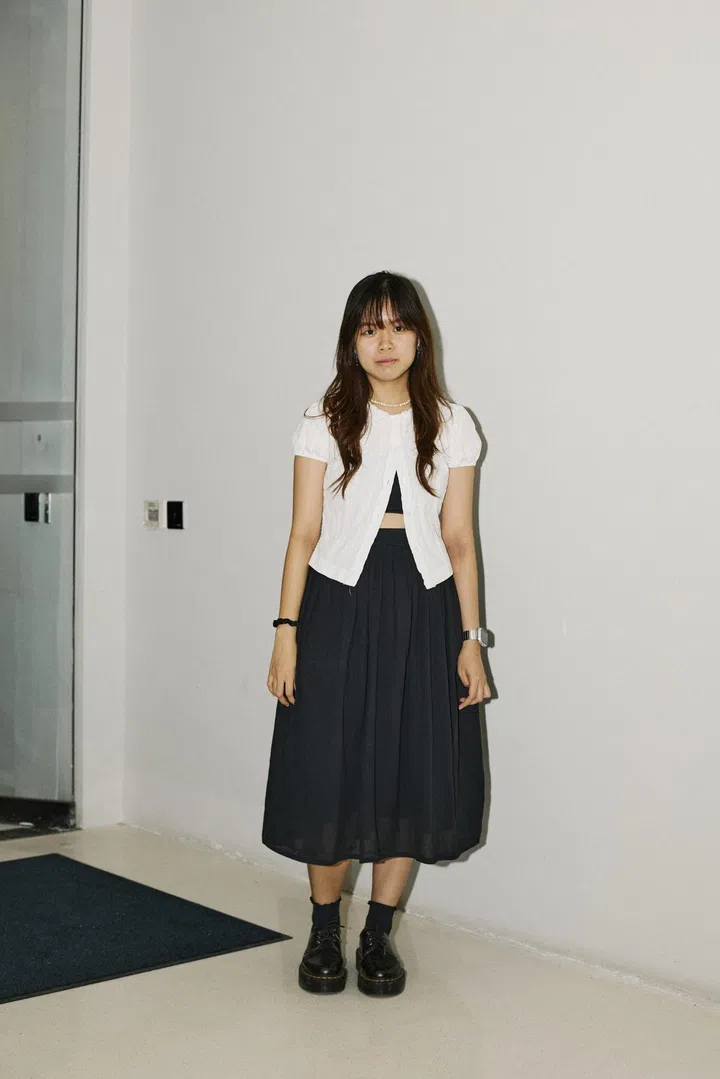 Her fit: "My top is from a Vietnamese store I found on Instagram, @lovable.saturday. My skirt is from Muji, and my boots are Dr. Martens."