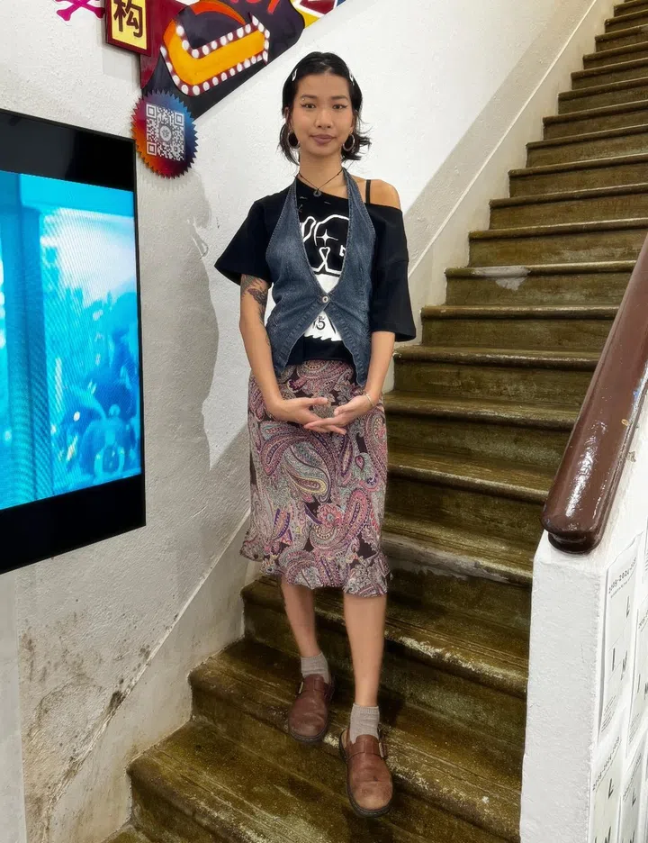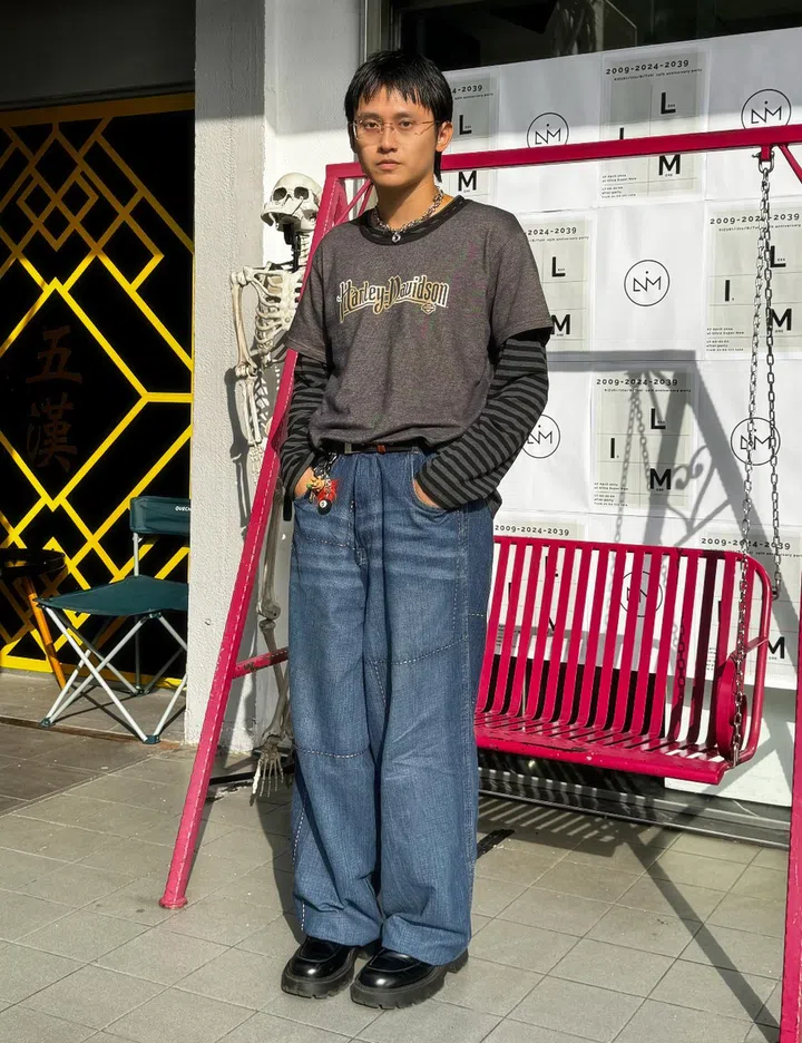 His fit: "The outer tee and jeans are thrifted. The inner tee is from Taobao. My mum bought the belt for me about 15 years ago. The key chain is from Daiso, and the troll on it used to be part of my wife's earrings. My wife bought the necklace for me and I like its punk-grunge vibe."