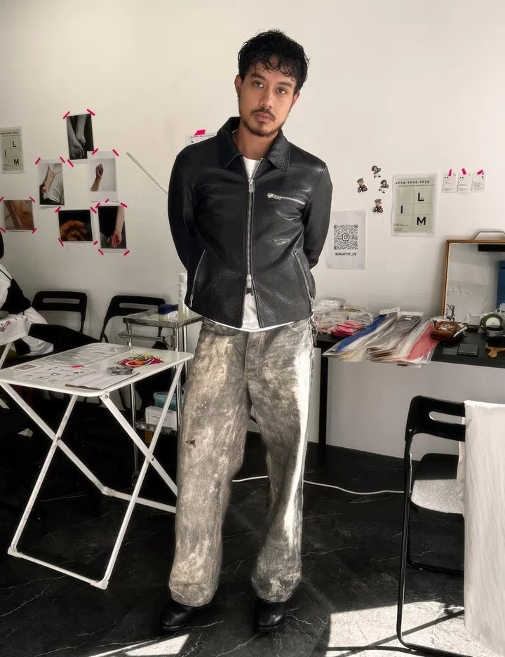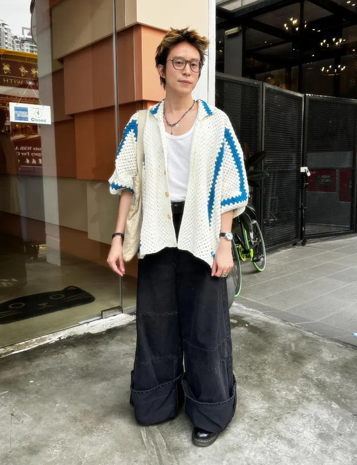 His fit: "The outerwear is a Bode-inspired crochet shirt painstakingly put together by my talented younger brother, who crochets in his free time. The pants are a pair of MM6 Maison Margiela wide-leg jeans that I managed to snag at a discount in Kuala Lumpur, and they remain one of my favourite purchases to date. The tote bag is from Stilnook, a local brand that I discovered thanks to one of the pop-ups at 1tto+LIM. Boots are from Dr. Martens."