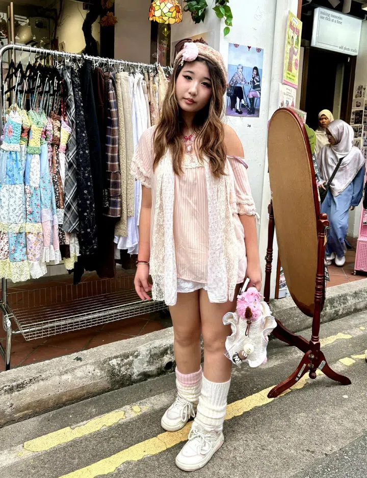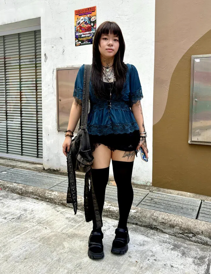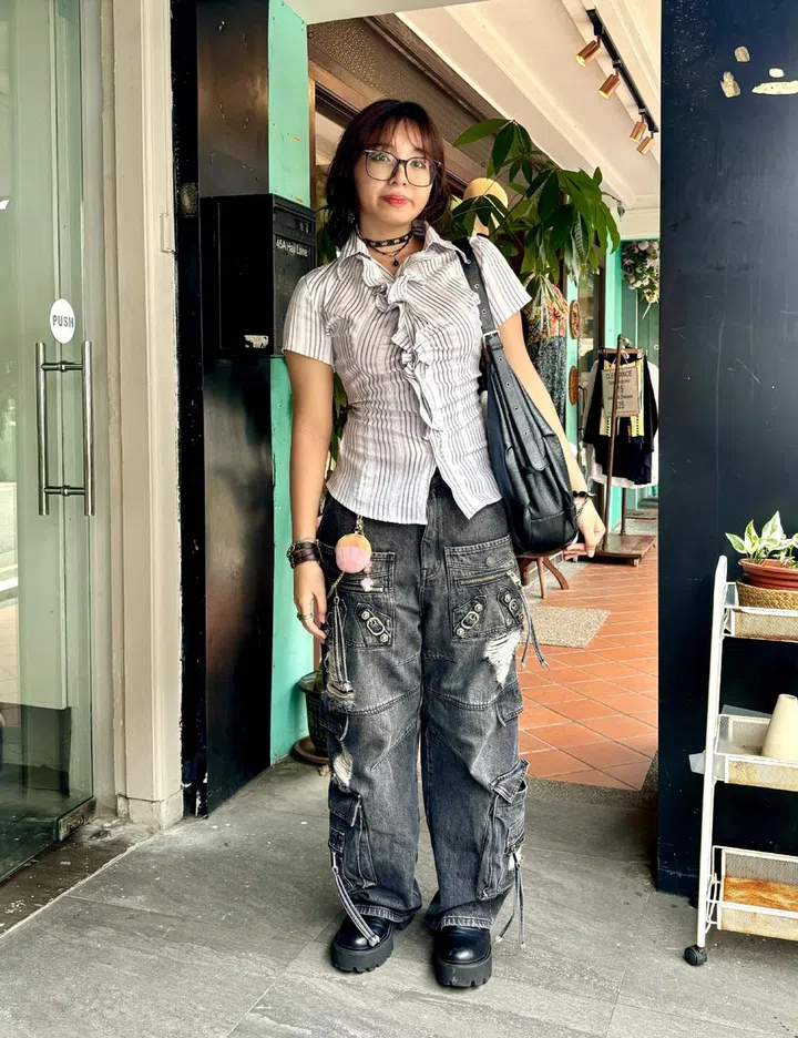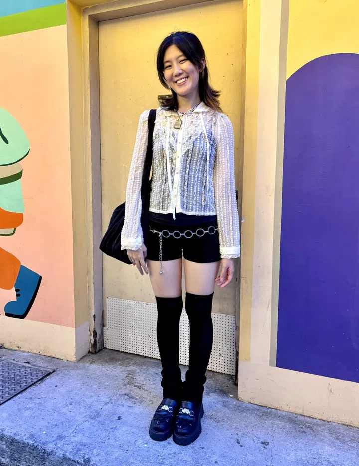 Her outfit: “I love thrifting! The top, shorts and belt are thrifted. My loafers are from Koi Footwear, leg warmers are from Shopee, and my necklace is from a local art market I visited a couple of years ago. The camisole, stockings and bag are just some items I've had lying around in my closet for years.”