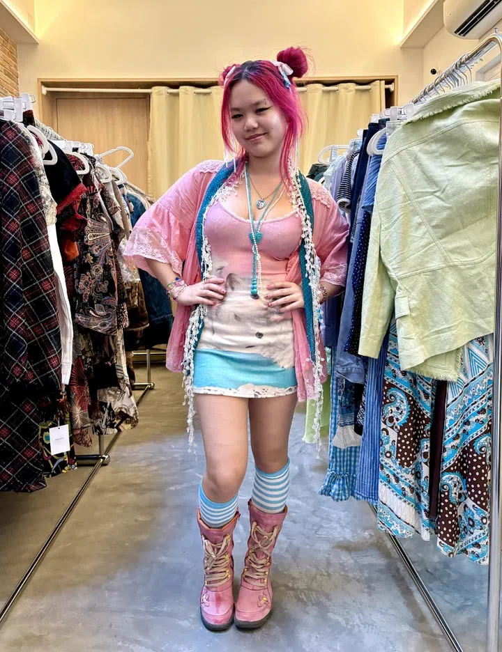 Her outfit: “My top, bag and accessories are all thrifted. My pants were bought from a pop-up shop in Tokyo. My bag keychains were all bought from Japan as well! My boots are Charles And Keith.”