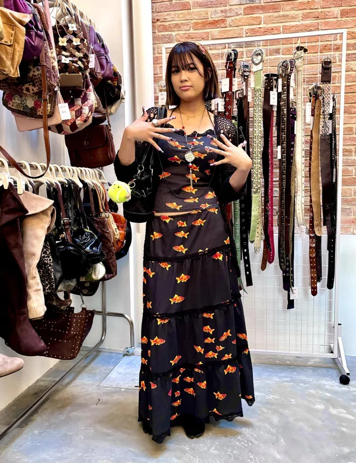 Inspiration behind her outfit: “I knew I wanted to wear my Tabi shoes, and I was rushing out of the house, so I put on this set. Wearing a long skirt is more convenient when trying on clothes in a store with no dressing room.”