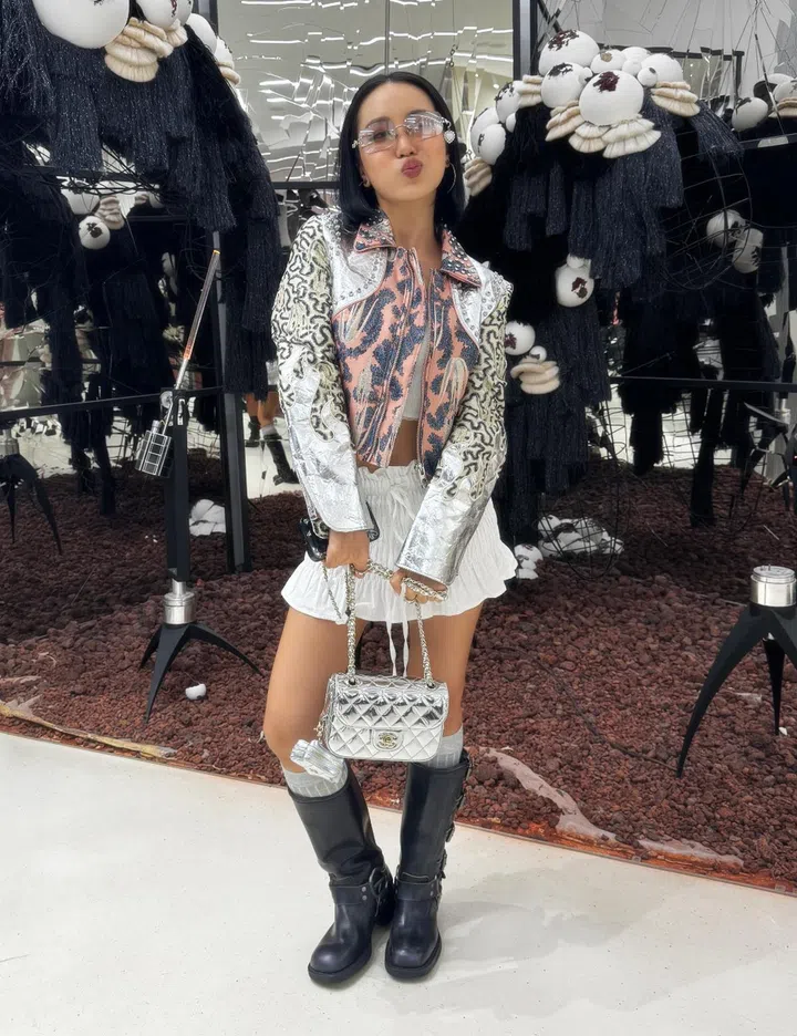 Her fit: "The jacket is from HM Studio's 2020 Archives, my top is from a Taiwanese brand called Mumm Official, and the skirt I'm wearing was originally a top from Beike Studio. I purchased my boots from Miu Miu and my bag from Chanel. As for accessories, I'm sporting Gentle Monster glasses from the new Jentle Salon collection, along with Chrome Hearts earrings."