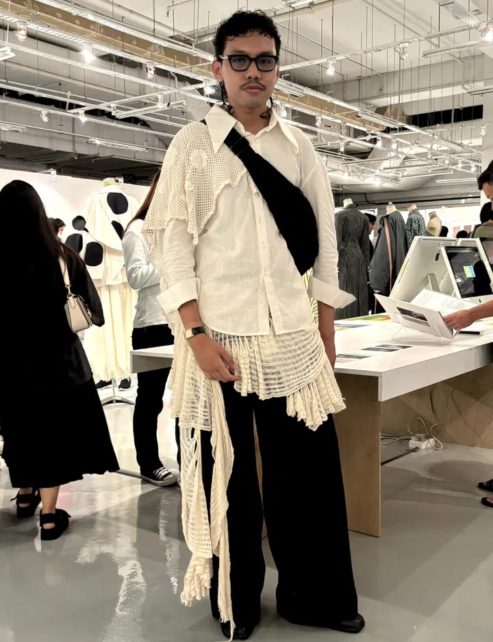 The inspiration behind his outfit: “I wanted to wear something that represented my final-year project (@sanctity.of.self) for the graduate exhibition opening night of the Lasalle Show. So, I wore a piece from one of the shoots, which is the crochet scarf, and styled it into a skirt-slash-belt. I had a shirt that paired nicely with it and has a similar crochet detail.”