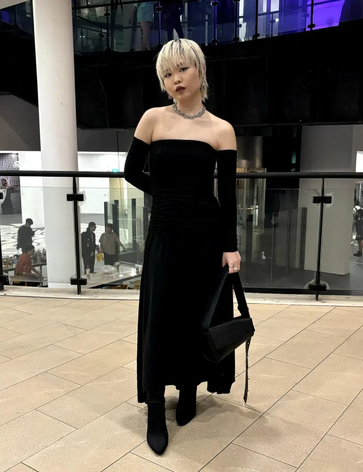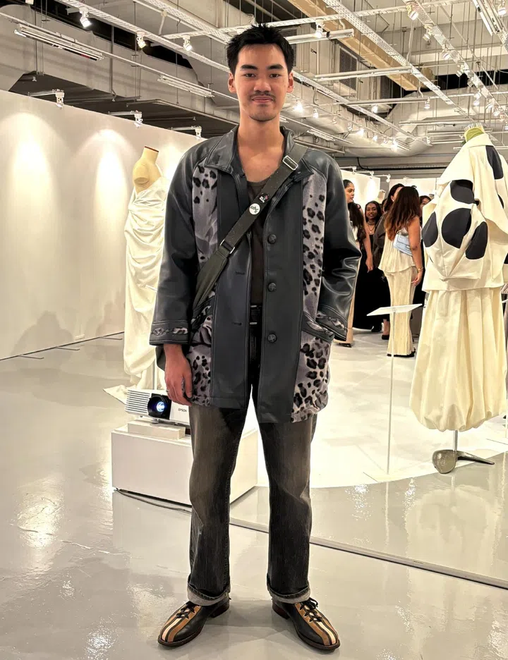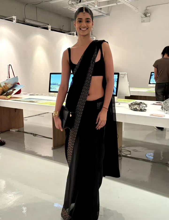 The inspiration behind her outfit: “My inspiration behind this outfit is my graduation project, Tjori. Since it's the opening night of the Lasalle Show, I wanted to stay connected to my project and my culture in the best possible way. Tjori delves into the richness and beauty of Indian jewellery, aiming to portray it in a modern light that resonates with Generation Z. Drawing from this, I wore a sari a traditional Indian dress, and paired it with a bandeau top and a more contemporary drape, embodying the fusion of tradition and modernity.”