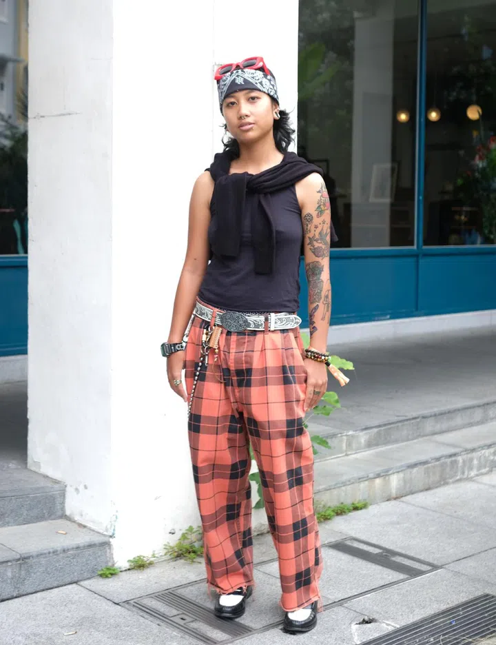 His fit: "My top is a band tee from the (Singapore) band Unknown Radicals' show in 2019. My pants are Scanner Fundamental blue denim jeans that I thrifted from Vintage Night Market Melaka. My boots are pleather ankle boots gifted from my dad, and my watch is a SKMEI piece."