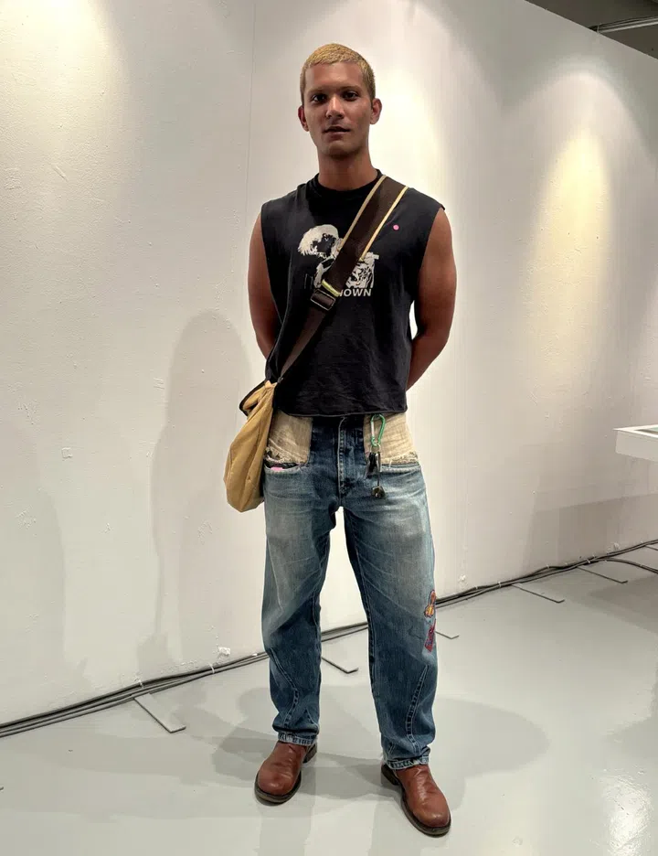 The inspiration behind his outfit: "I aimed to achieve a cool yet comfortable look. I own these highly distinctive work jeans that I purchased in Malacca. I wear them so frequently that I've had to patch them numerous times. I also enjoy personalising the pieces I wear to make them uniquely mine; hence, I often add patches, crop them, or remove sleeves to customise them a bit. I did the same with the Unknown Radicals shirt I’m wearing in this outfit."