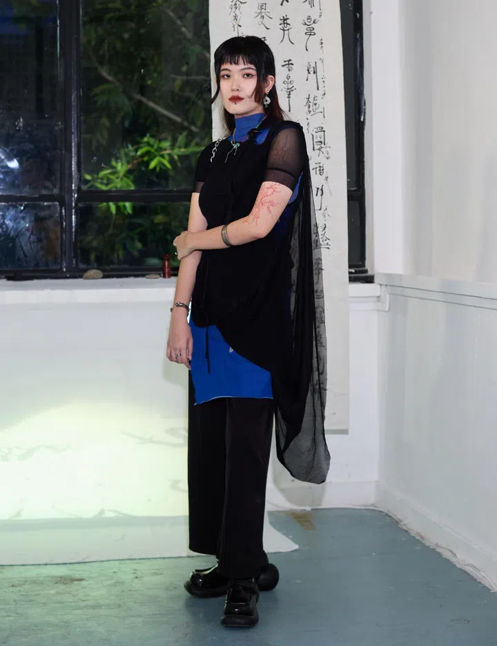 Her fit: “The mesh dress I’m wearing is from Ottolinger, and the pants are thrifted. The blue mesh top is from Taobao. My shoes and bag are from a store called Hijacked. For my accessories, I am wearing antique silver bangles and a ring that are from the Hmong tribe (who reside primarily in Southwest China).”