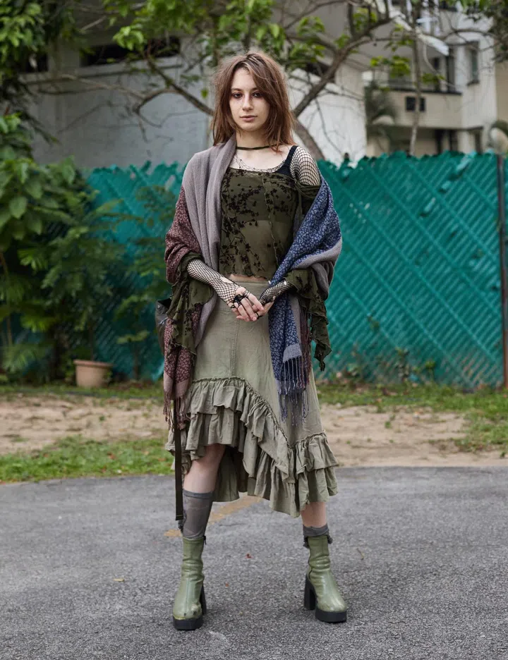 Her personal style: "I feel like I resemble a cross between a goblin and a fairy from a Studio Ghibli film. Yes, I love the fairycore or goblincore trend. I adore being surrounded by greenery, as green is my favourite colour, and I enjoy wearing earthy tones. Incorporating green into my personal style is so important to me that it practically reflects my personality."