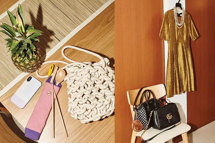This crochet chopstick pouch (left) which her mum knitted is one essential she carries everywhere. A Line Friends keychain (right) gives an idiosyncratic touch to her black bags.