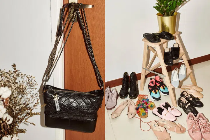 Left: Chanel's Gabrielle Bag is her choice for a day bag. Right: Slides and sneakers (most in pastel shades) dominate her shoe collection.