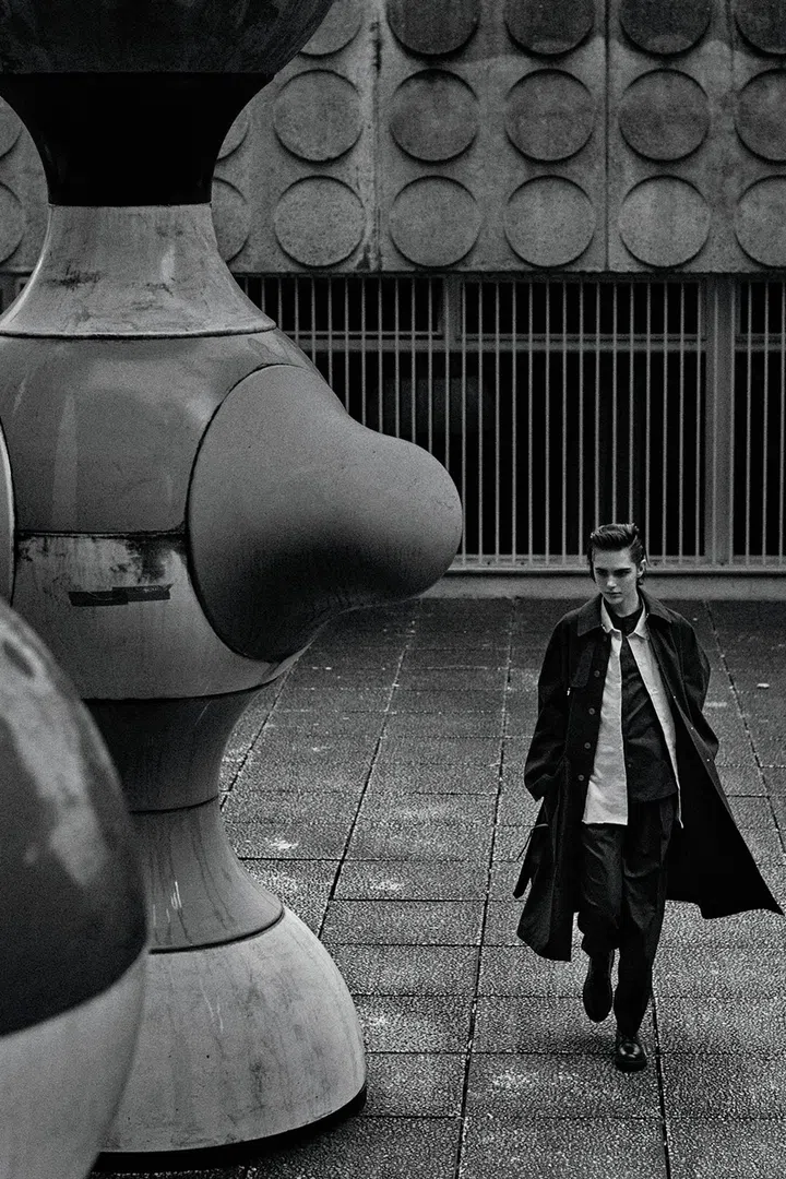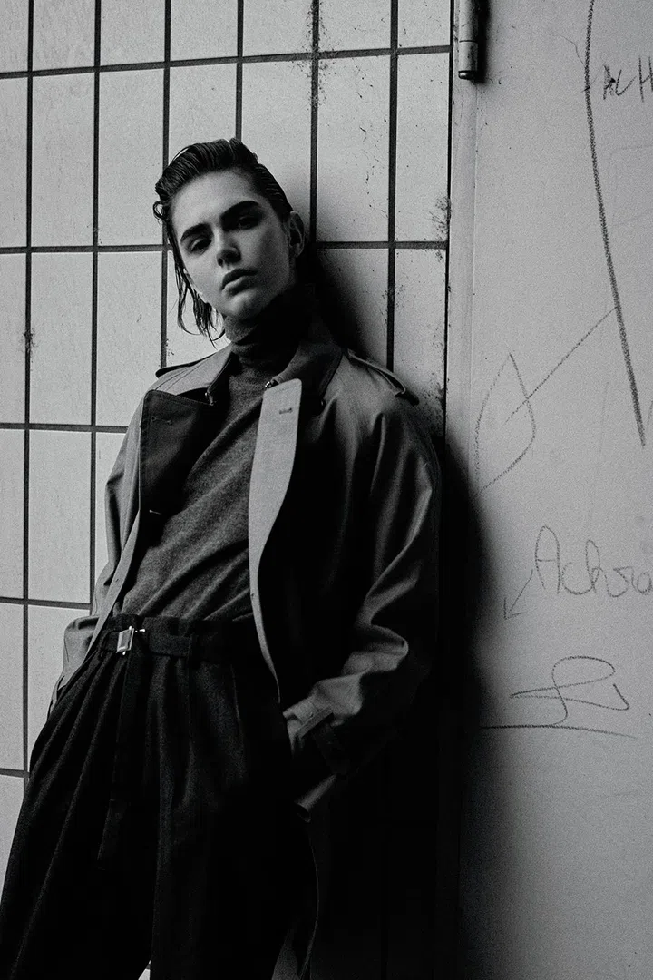 Wool trenchcoat, matching pants, and cotton shirt, Hermes. Leather derby shoes, Valentino. Shirt (worn underneath), stylist’s own.