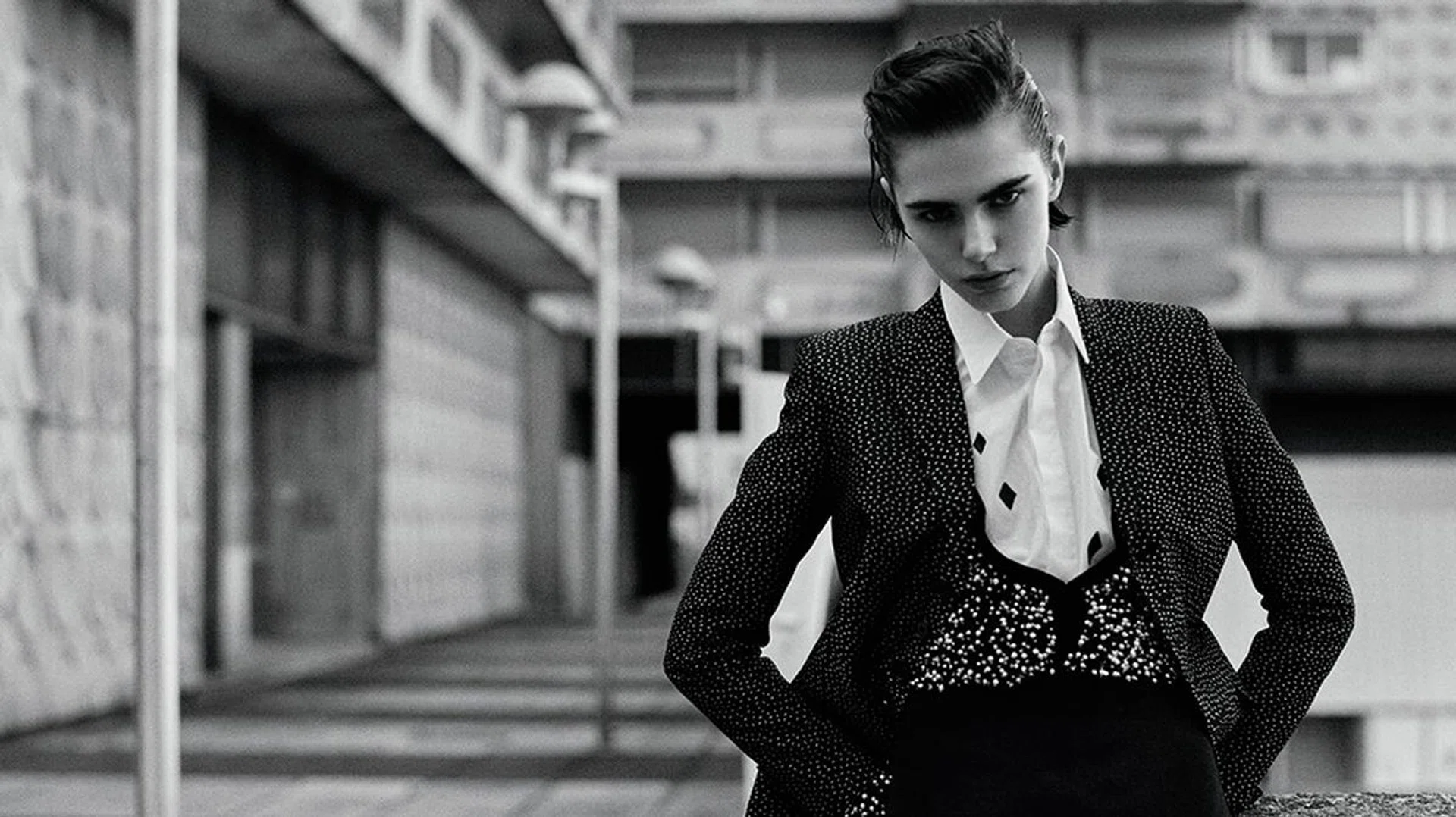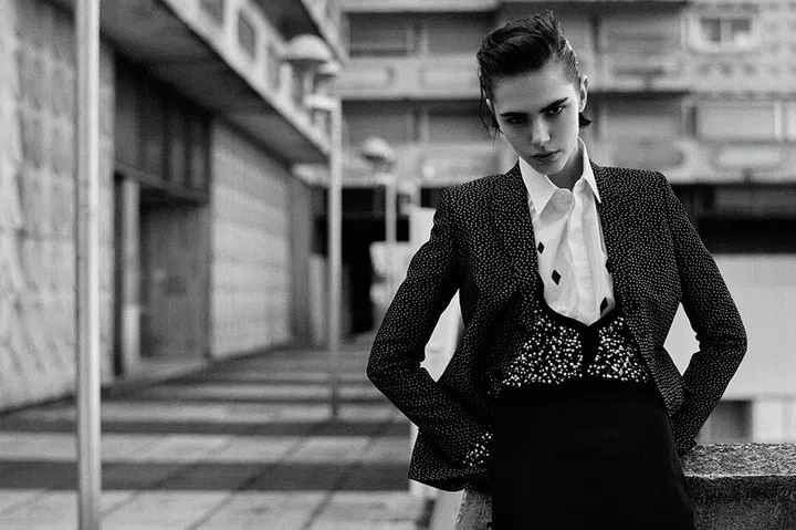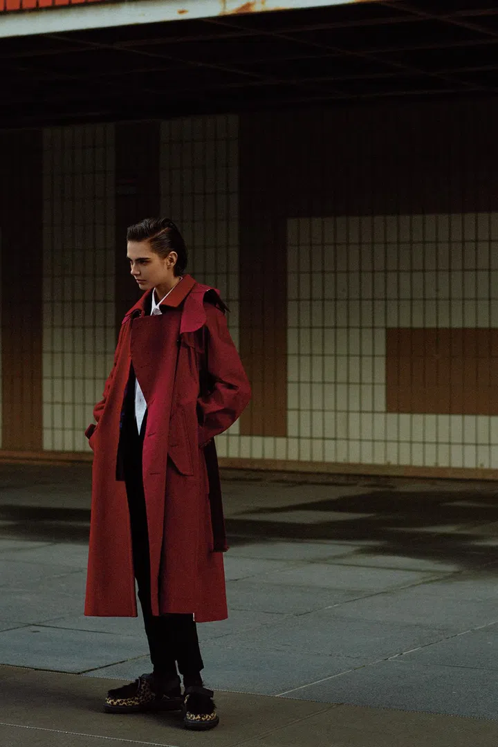 Sacai cotton-blend trenchcoat, cotton shirt, and ponyhair shoes, Sacai by Club21. Saint Laurent by Anthony Vaccarello wool twill suit, Saint Laurent.
