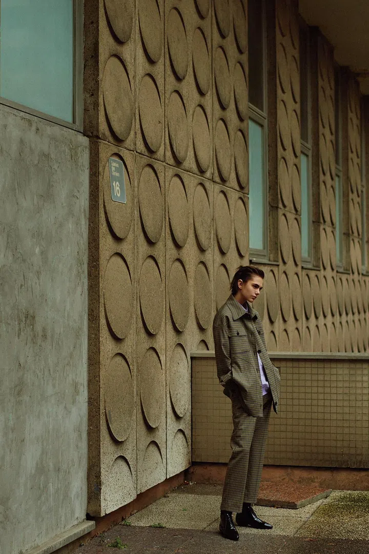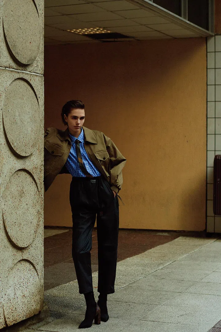 Rochas cotton field jacket and cupro pants, Club21 Four Seasons. Saint Laurent by Anthony Vaccarello patent leather boots, Saint Laurent. Shirt, stylist’s own
