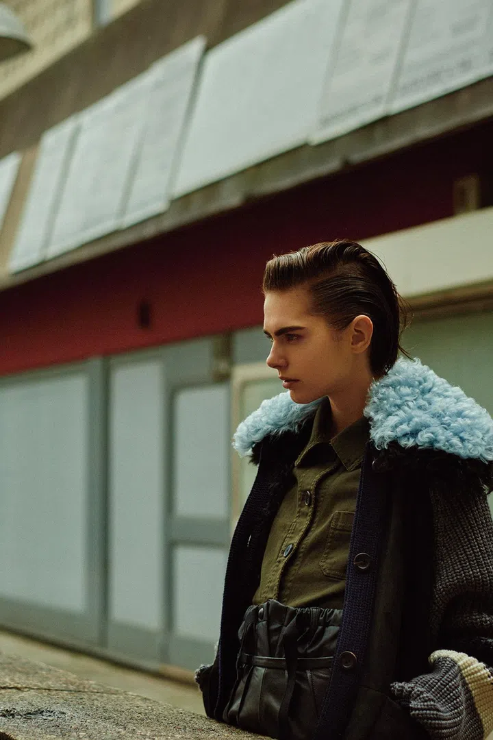 Rochas cotton bomber, Club21 Four Seasons. Jersey pants, and leather and canvas boots, Louis Vuitton. Shirt and tie, stylist’s own