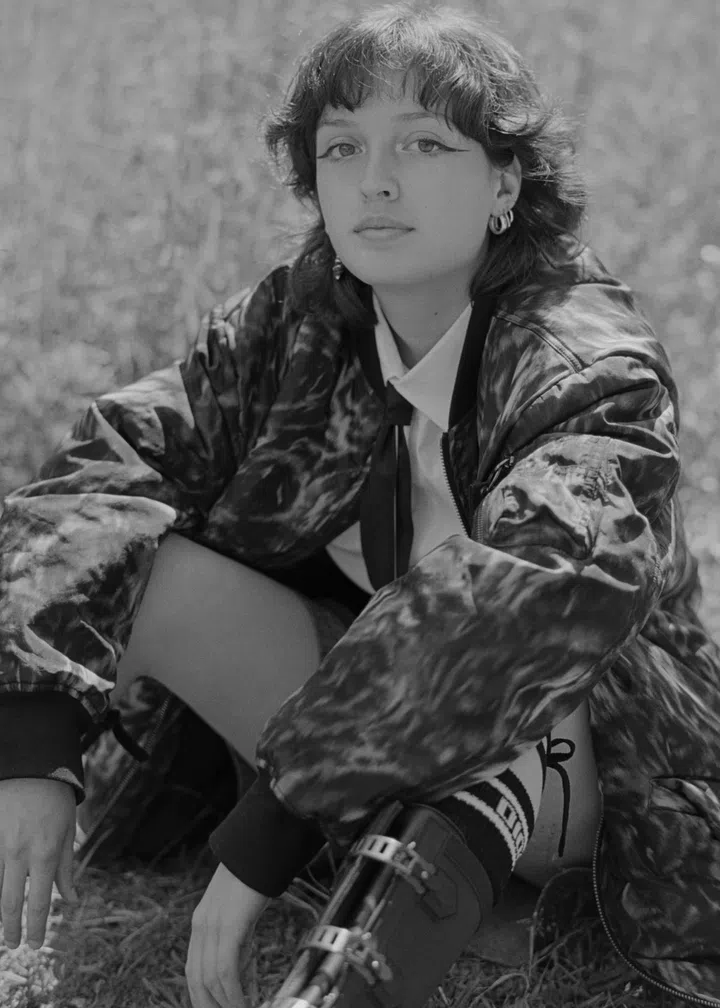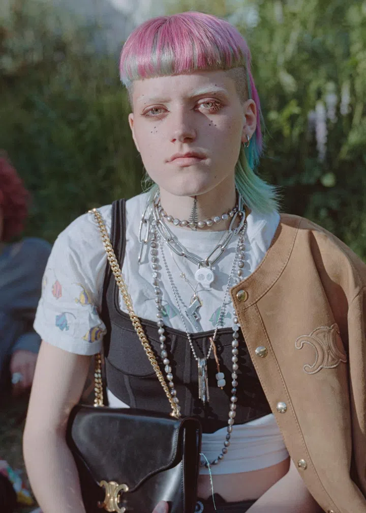 Louise, a student, wears Celine by Hedi Slimane suede jacket and viscose crop top (as corset), with Chain BesaceTriomphe calfskin bag, Celine. All clothes and accessories throughout, stylist’s or subject’s own unless otherwise stated