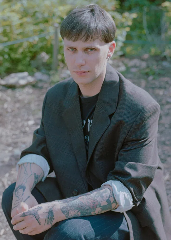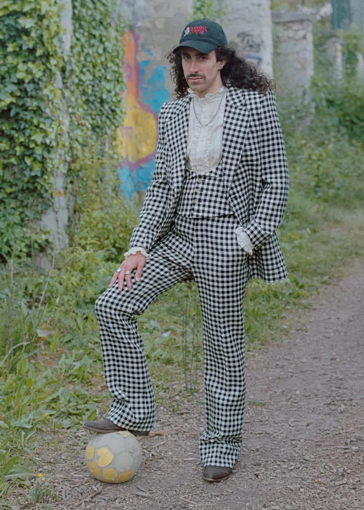 Quentin, the frontman of electro punk/noise band Modern Men, wears a wool blazer and matching pants, Prada