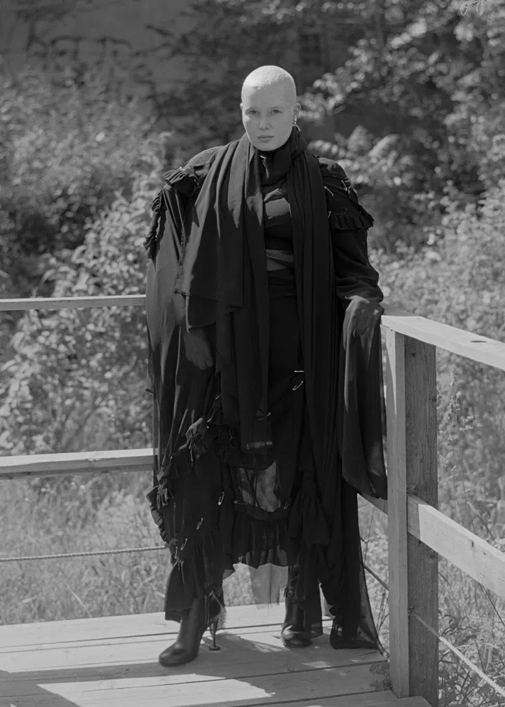Anna, an art teacher, wears a technical chiffon dress, sterling silver ear cuff and calfskin boots, Balenciaga