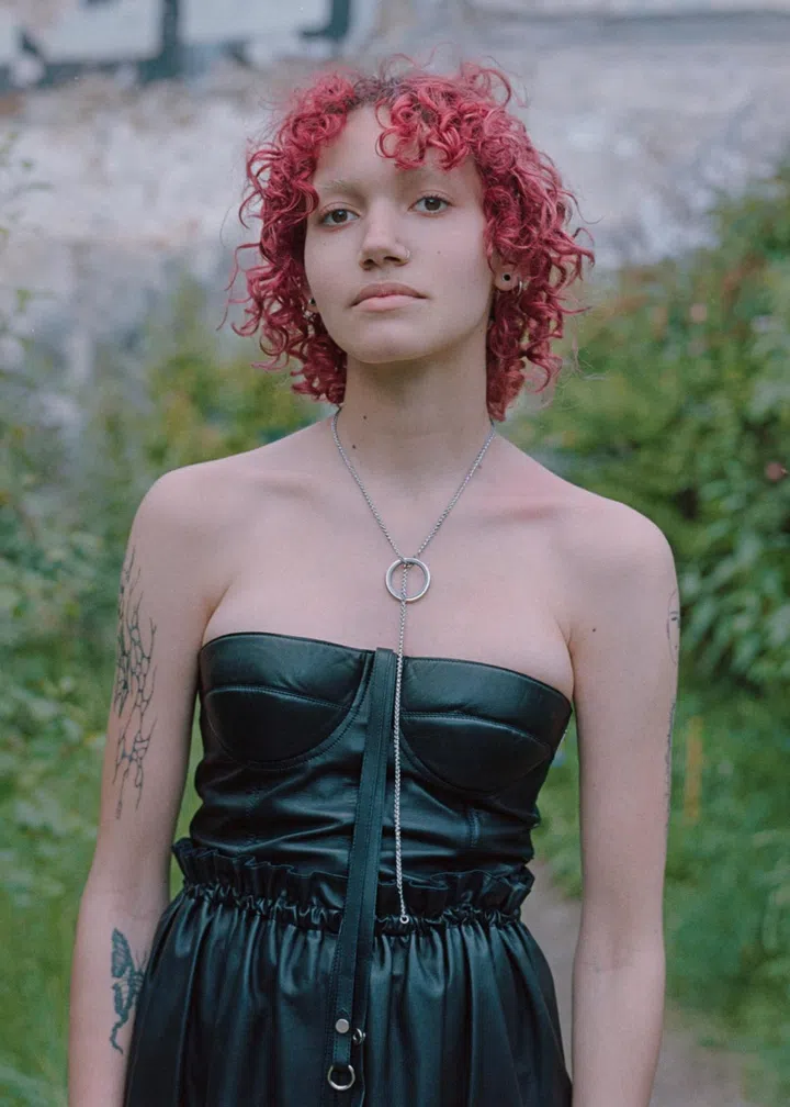 Isa, a student, wears a calfskin bustier dress, Hermes
