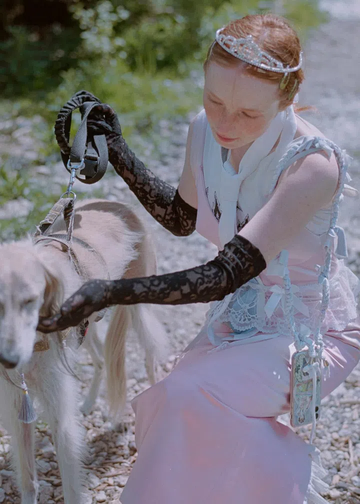 Apoline, an illustrator (pictured here with her pet Afghan hound Thalia), wears a silk dress and gloves, and metal tiara with crystals, Gucci