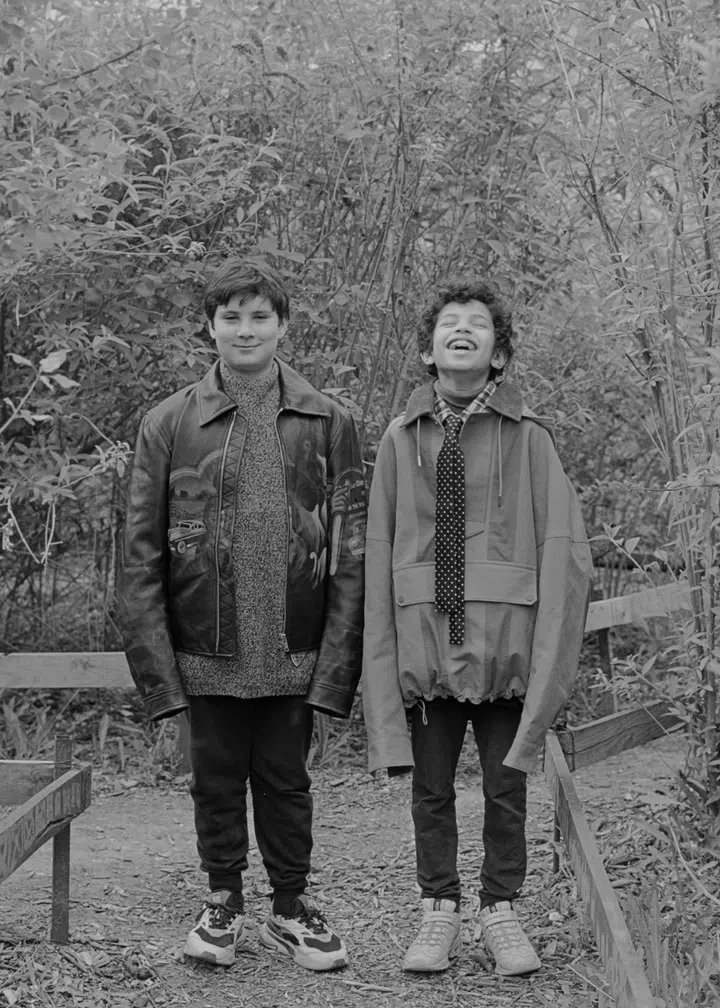 Adam (left), a nine-year-old, wears a leather blouson and cashmere knit top; and Jessim (right), a 10-year-old, wears a cotton hooded anorak jacket and silk polo shirt. All Dior Men