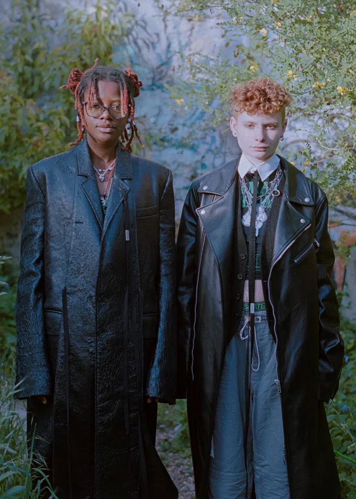Maurine (left), a student, wears a laminated merino wool coat with matching detachable collar; and Bleo (right), a student, wears a calf nappa leather coat, wool vest and poplin cotton collar. All Ann Demeulemeester, as.anndemeulemeester.com