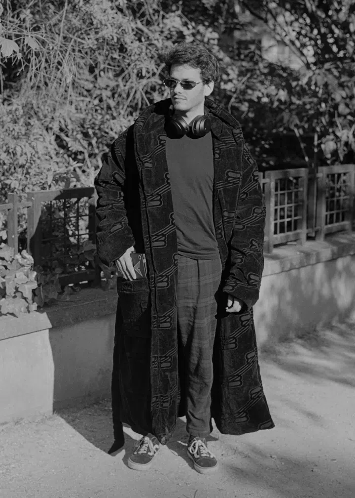 Eyal, a web3 developer, wears a jacquard terry cloth coat and Tag 2.0 metal sunglasses, Balenciaga