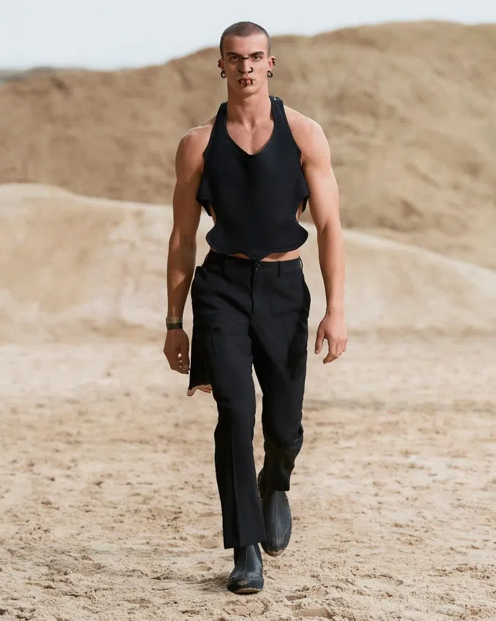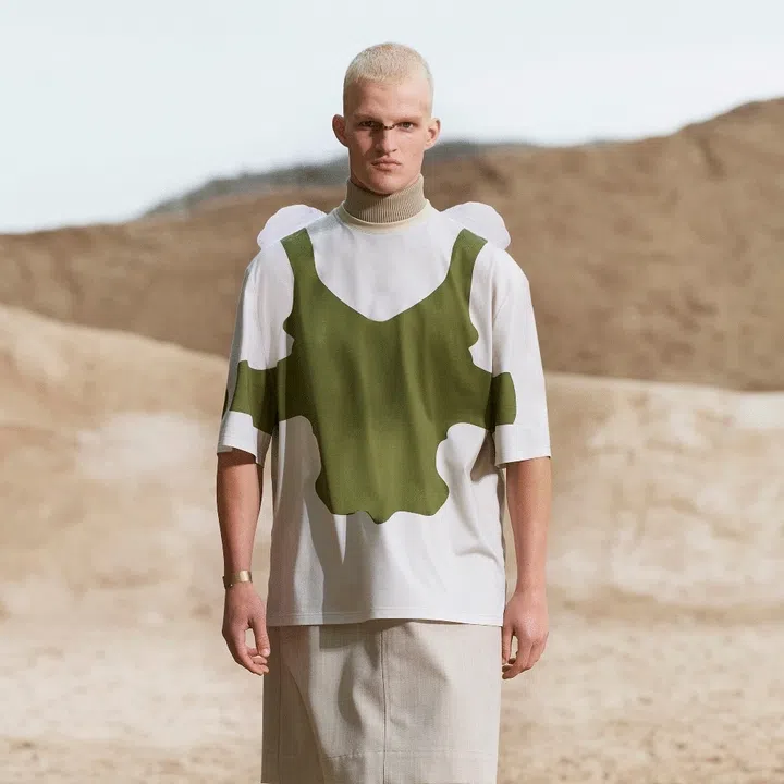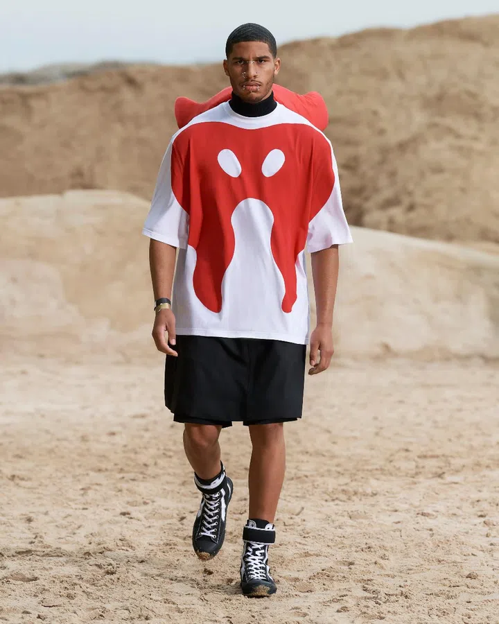 Braced with an honest and daring attitude, models strutted down the deserted sandy dunes to a hypnotising electronic dance soundtrack in a gender-fluid wardrobe of reinterpreted classics, abstract prints and non-conforming silhouettes that evokes a fresh sex appeal and youthful positivity.