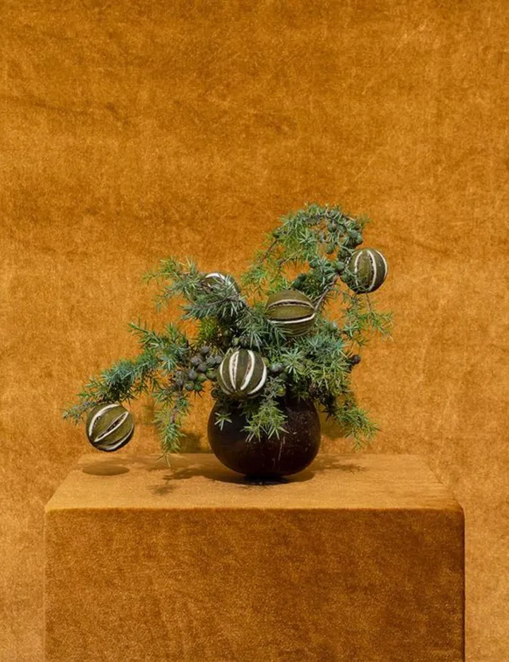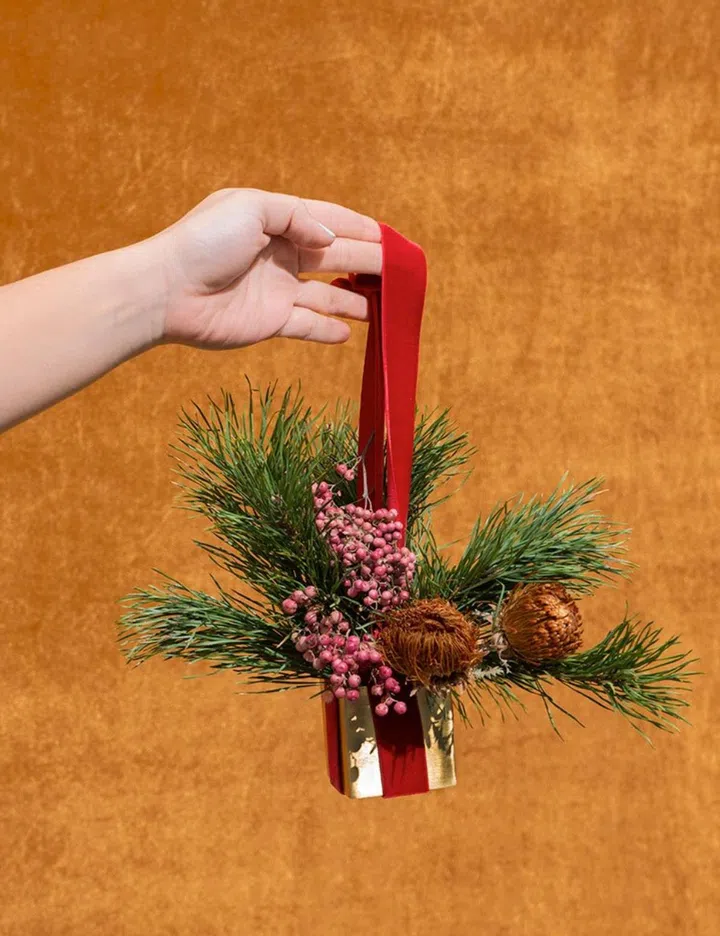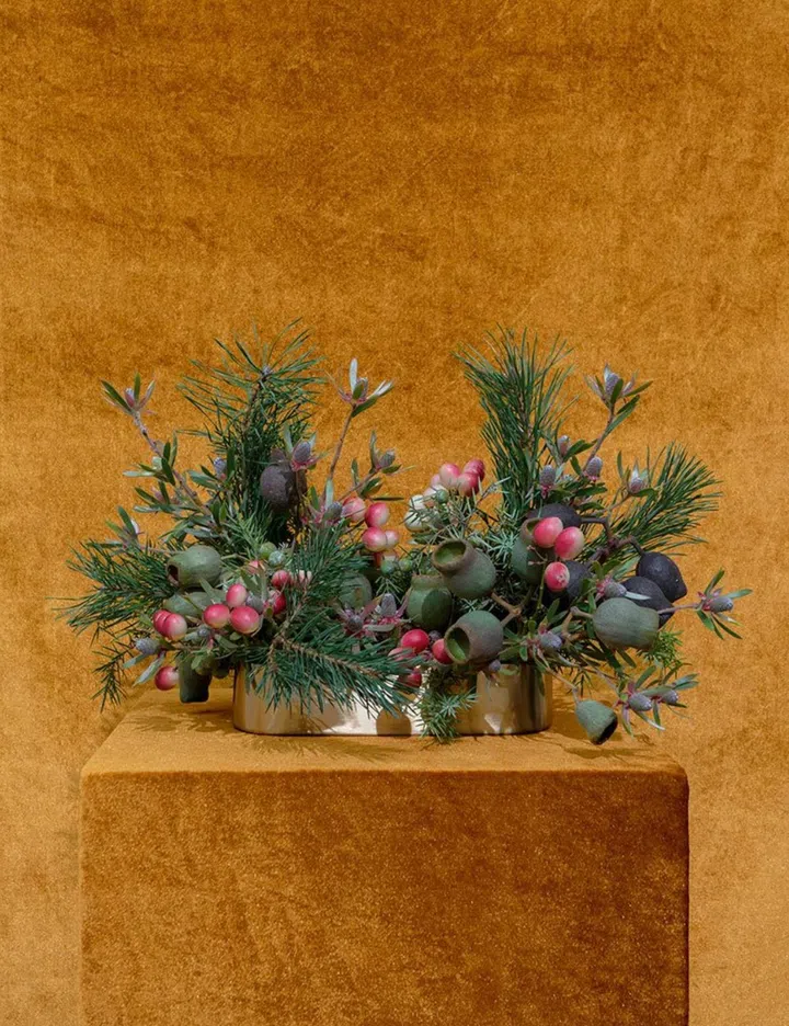 The Little Pine ornament ($100) comprises a brass cube packed with pine, dryandra and pink peppercorn, and finished with velvet ribbon. It can be hung on the Christmas tree, a clothes hook or doorknob.