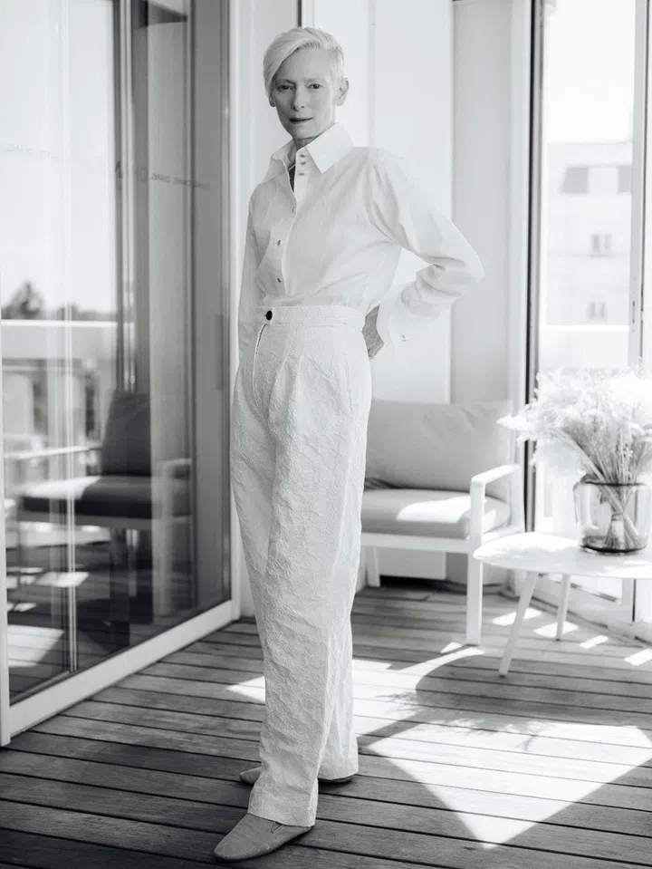 For a photo call for her leading role in Memoria by Apichatpong Weerasethakul, Swinton cut a pristine figure in a white cotton shirt and matching cotton pants from Chanel's Cruise 2022 collection.