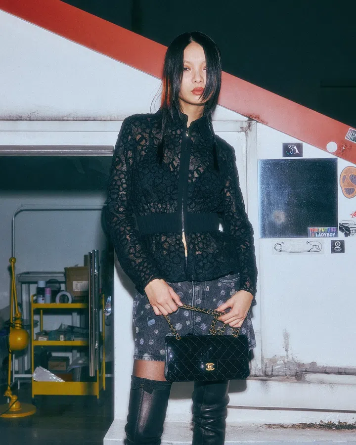 Victoria wears lace jacket, denim skirt, patent leather flap bag with patent leather and metal chain strap, and leather boots, Chanel. Bralette (worn under jacket), subject’s own