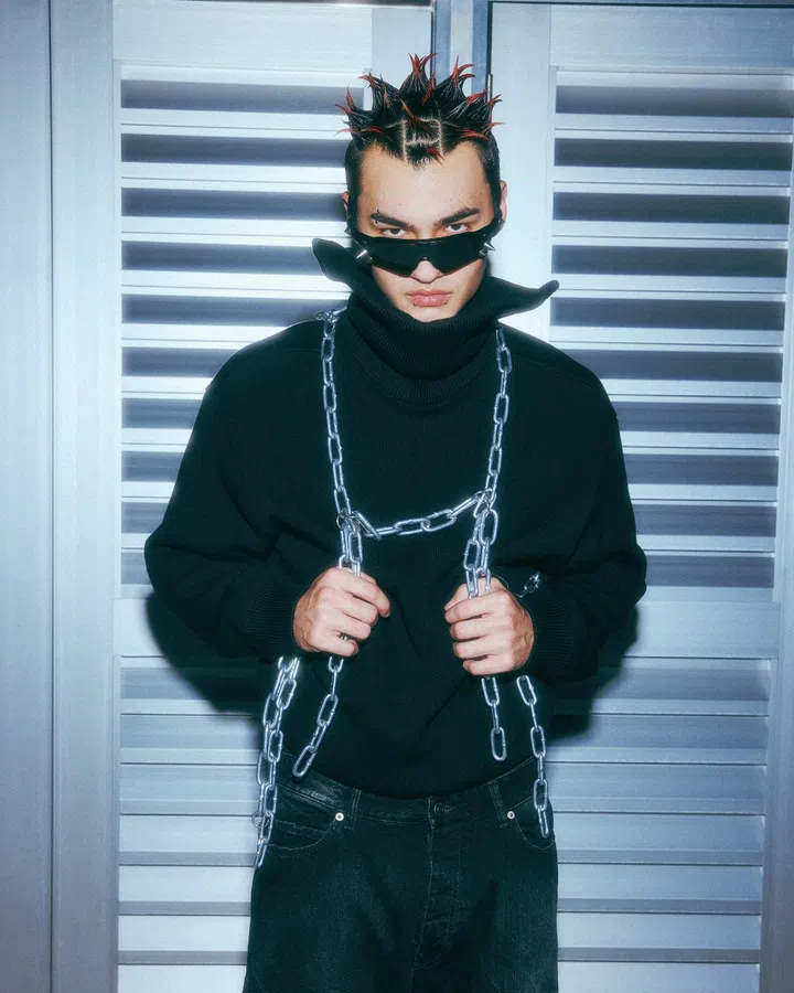 Ryan wears wool-blend top and denim jeans, Balenciaga. Vintage Comme des Garcons metal chain harness and Vetements acetate sunglasses, Upstairs Garments