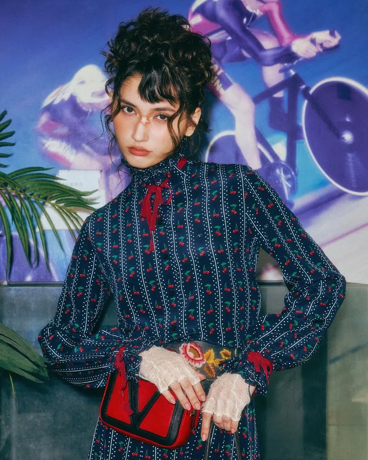 Megan wears Valentino by Alessandro Michele crepe de chine shirt, matching skirt, and cotton socks; and Valentino Garavani embroidered calfskin belt, Vlogo Signature lace and leather gloves, Viva Superstar nappa leather belt bag with metal chain, Nellcote mini suede and linen bag with beaded embroidery and metal rivets, and Fawcette calfskin platform sandals, Valentino