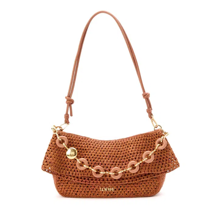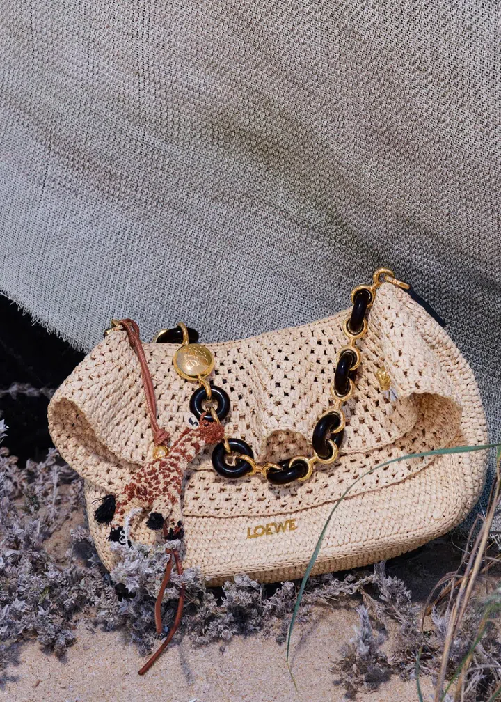 A new raffia bag makes its debut: the Ola, crafted with traditional weaving techniques and a wavy silhouette, finished with a playful donut chain. The name is fitting – just like its meaning, "wave" in Spanish, it’s bound to make a splash.