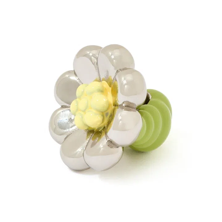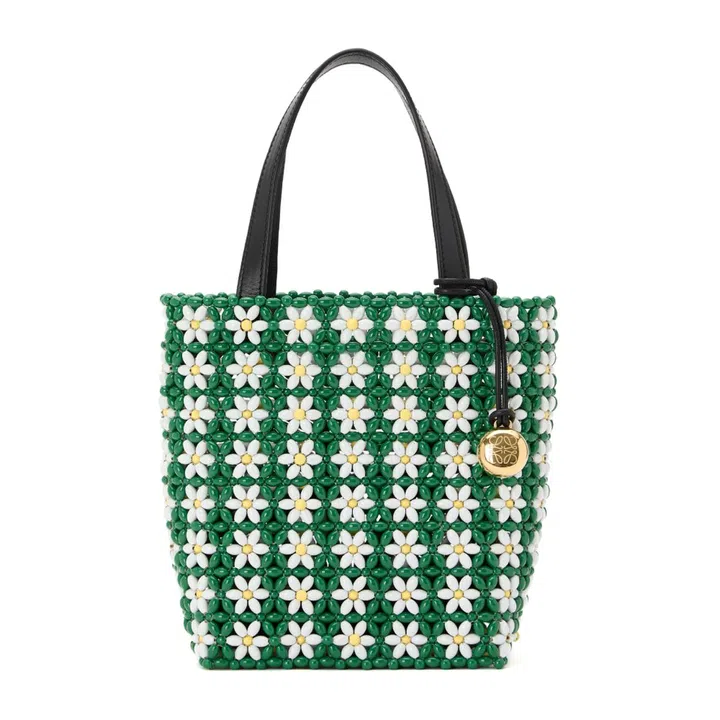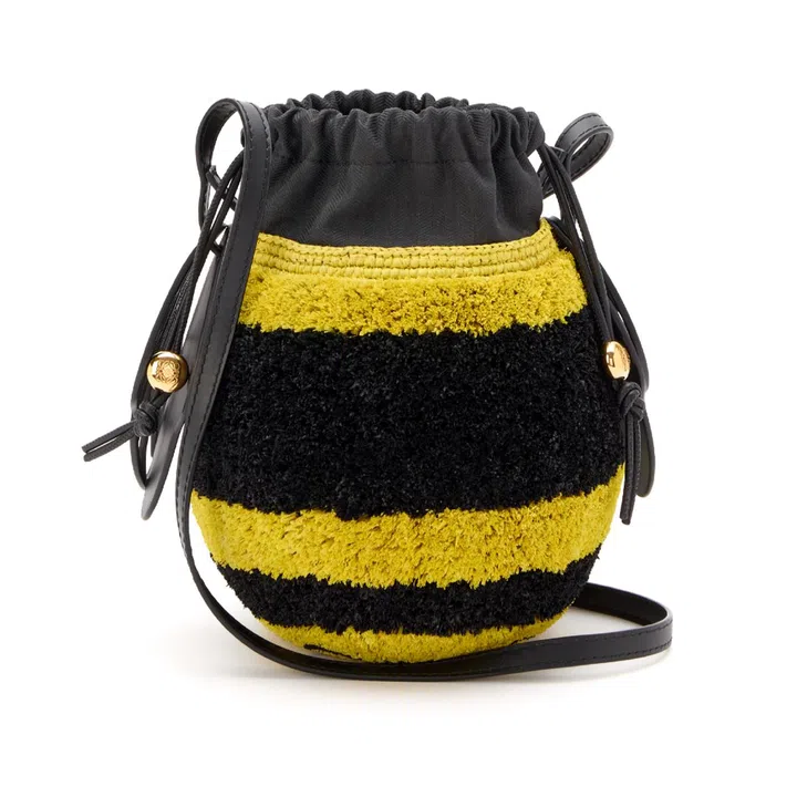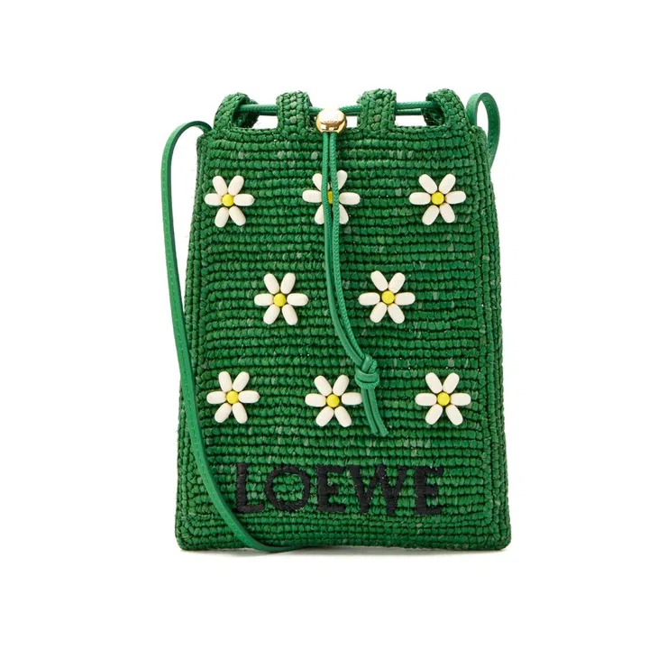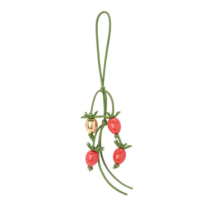 Accessories fully embrace maximalism — handcrafted charms shaped like fruits, bugs, and blooms dangle like inside jokes for fashion nerds. Bees and flowers reign supreme, showing up across small leather goods, rings, charms, and even sunglasses. The new Ola raffia bag, featuring traditional weaving and a wavy silhouette topped with a chunky donut chain, is a standout.