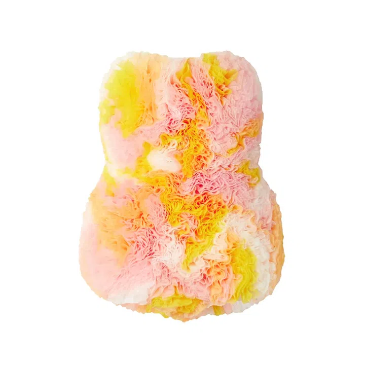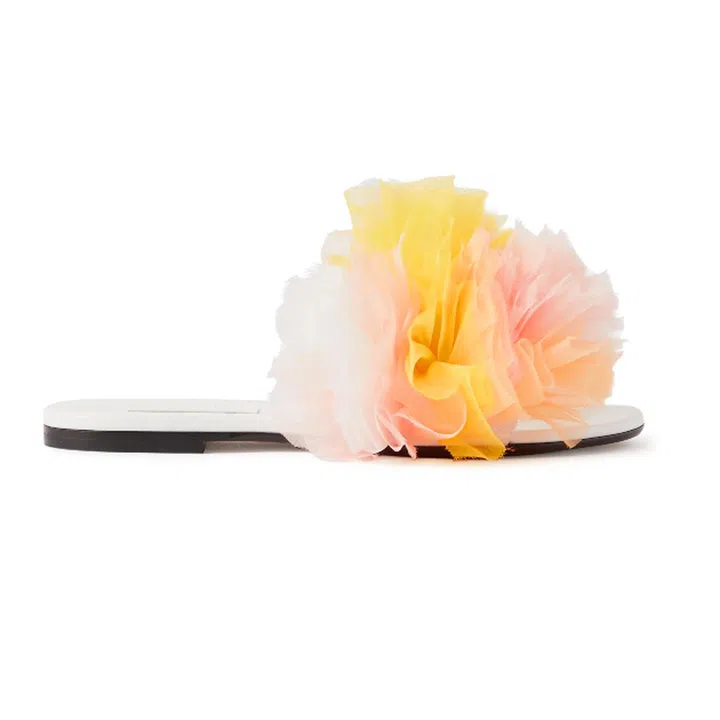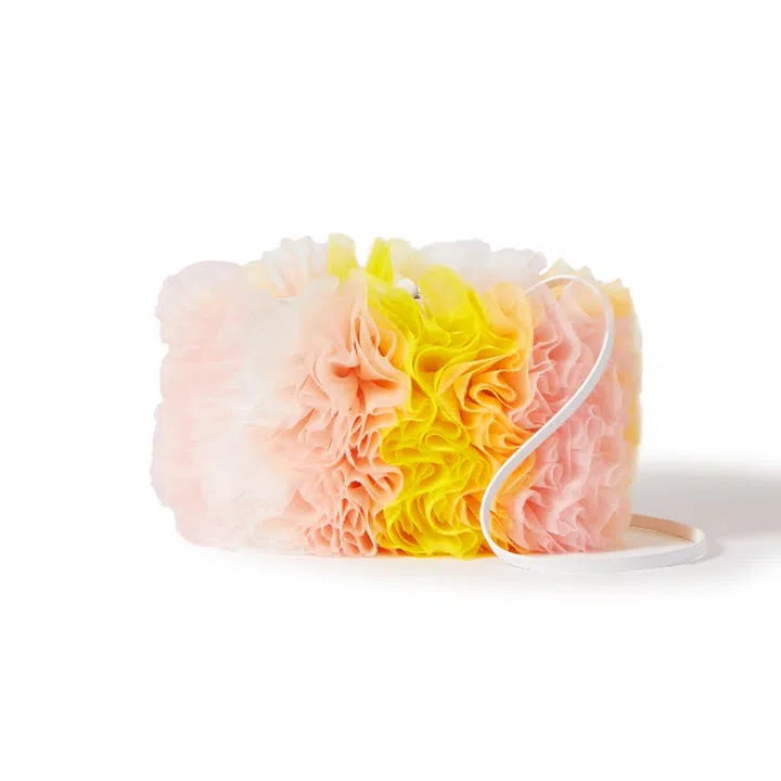 Riffing on the Vetrate's sherbet hues of peach, yellow and pinks, Koizumi moulded yards of organza into cloudlike garments that include a halter top, mini dress, sandals, bag and T-shirt – creating perfect pieces for our post-quarantine dressing.
