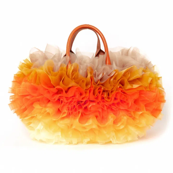 While the collection is a tightly curated edit of only three styles, it goes big on making a playful fashion statement by marrying Tomo Koizumi's signature puff ball aesthetic and Sacai's trademark hues (the military khaki green colourways and the sunny orange shades are colours that Sacai designer Chitose Abe revisits regularly for her work).