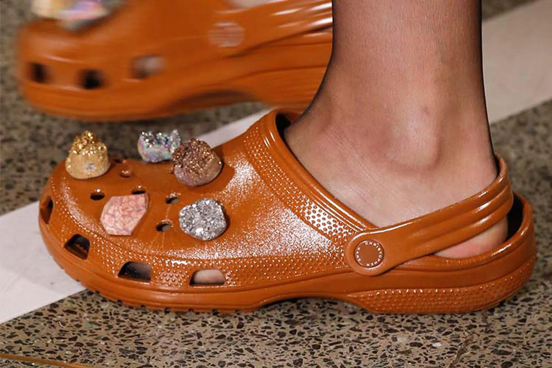 None of this, however, has quite prepared the fashion crowd for just how far designers have pushed footwear into the anti-fashion territory this season. The boldest statement comes from Christopher Kane, who teamed up with Crocs – yes, Crocs – on stone-studded variations that, according to WWD Footwear News, will be produced for sale. MSGM created a shoe akin to a ballet flat-meets-sports trainer-meets-ankle monitor, what with its cushioned sole and extra thick ankle cuff. Meanwhile, Prada’s sandals seem to have come from your neighbourhood auntie’s wardrobe: plasticky, bubble-gum-hued and available plain or adorned with tacky florets.