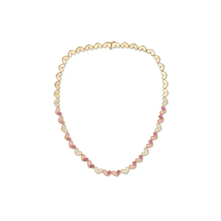 New York-based jewellery brand Gemella is known for its girly-cute take on fine jewellery – and this piece with its heart-shaped pink opals and sapphires is a prime example of that.