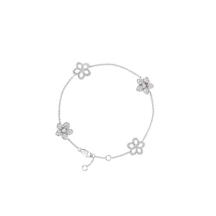 This elevated take on the charm bracelet features a medley of floral motifs that are paved with scintillating diamonds by the British jeweller.