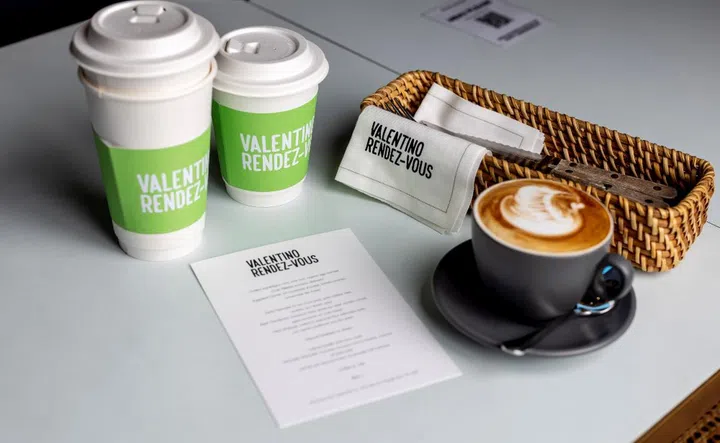 Valentino's two week-long pop-up cafe at Merci Marcel sees co-branded designs on napkins and cup sleeves.
