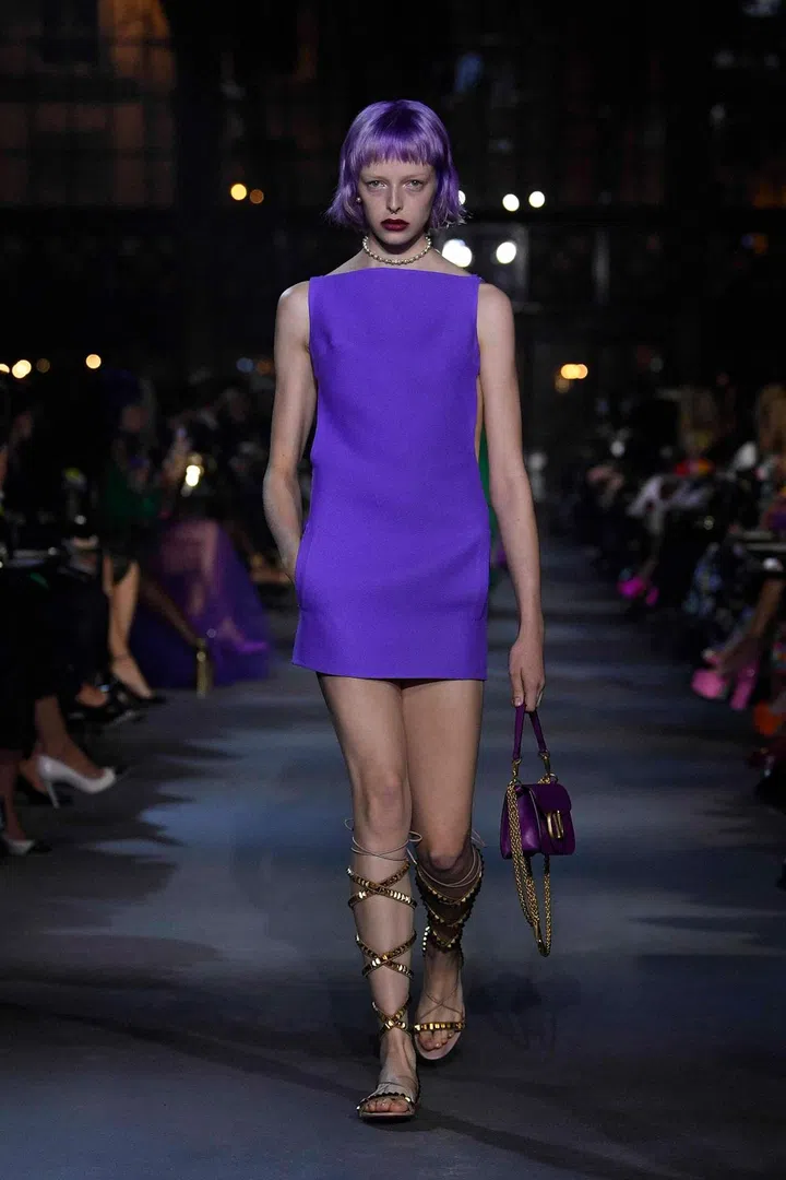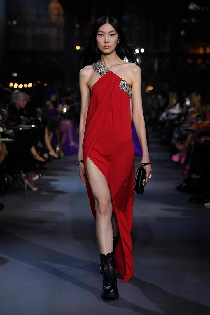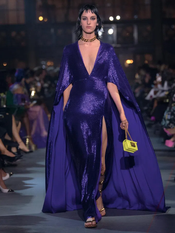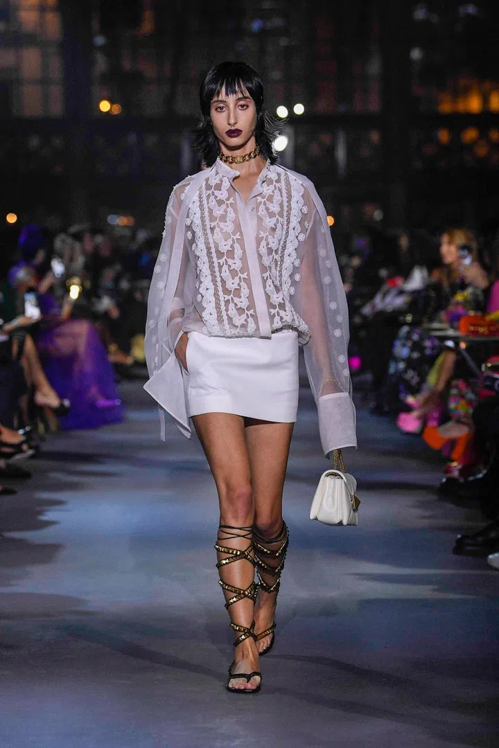 Piccioli also connected the past with the present, reimagining iconic looks from the house’s archives. The opening look, a white dress decorated with delicate white flower applique, was a replica of the one worn by Marisa Berenson in 1968. In its 2021 revision, the dress was given a rock n roll edge when paired with black boots and a thick gold chain necklace.