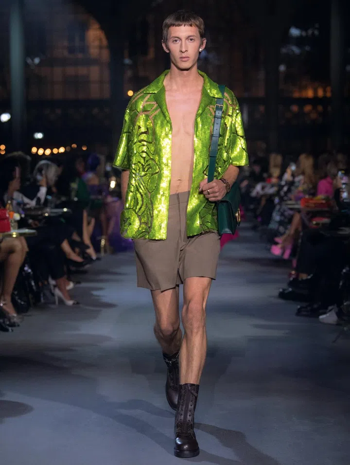 The lines between feminine and masculine were blurred, as men and women were dressed in the same pieces — rendered in flamboyant colours, graphic floral prints and broderie anglaise — styled in the same way.
