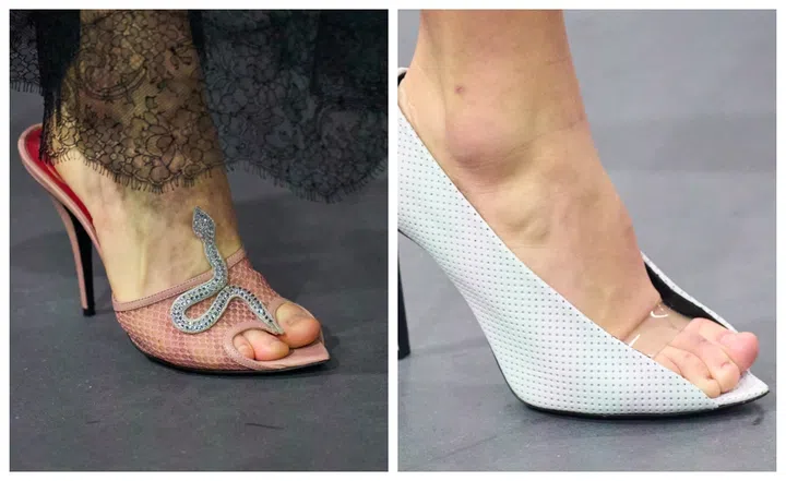 Even in a show full of visual drama, the shoes still managed to steal focus. One standout pair took the idea of open-toed heels very literally — sliced open right through the middle and held together by clear straps, leaving toes fully exposed. Slightly freaky, completely fabulous.