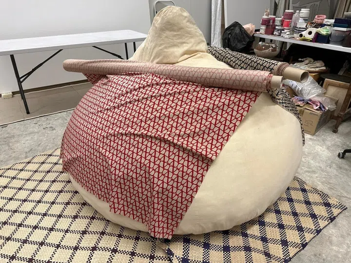 PS: "I asked Shone Puipia (her son, who is a fashion designer with his own eponymous label) to make a prototype of my sculpture in toile fabric. When the official materials arrived (from Valentino), at first I thought I could insert a wire frame within the sculpture. But that didn't work as I required (custom wire frames to be constructed) and it was close to the festive period; most construction companies were starting to close for the holiday season. My solution was to fill each of the sculpture with 40 kilograms of stuffing and it came together alright in the end, with Shone's help."