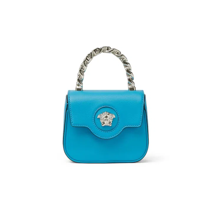 A classic silhouette like the top handle bag gets an injection of youthful energy in cyan.